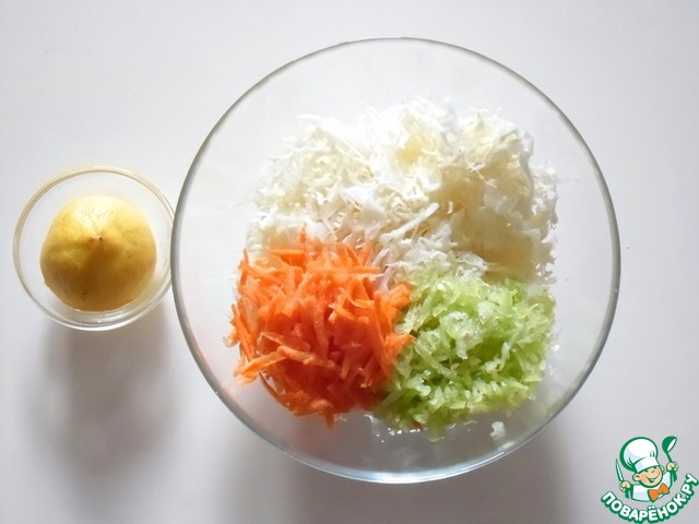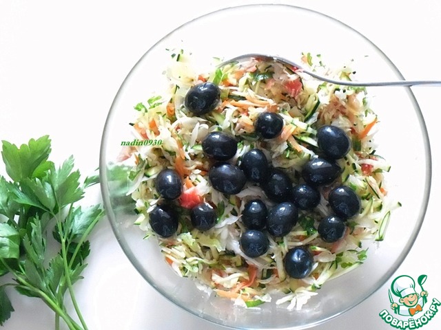 • Цукини нарезать тонкой соломкой, добавить к овощам.