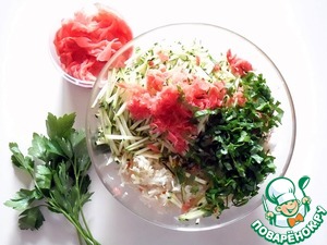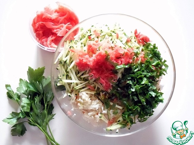 • Маринованный имбирь слегка отжать от маринада, нарезать полосками, зелень порубить, смешать с остальными овощами.