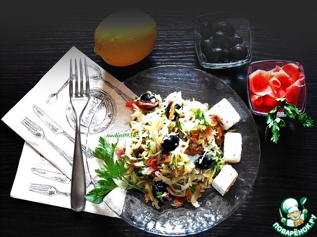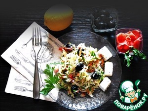 Для этого салата не нужно ничего варить-жарить, просто взять по-немногу овощей, добавить маринованный имбирь, маслины и мягкий сыр, получается вкусный салат. Попробуйте - он хрустящий, пряный, сочный!