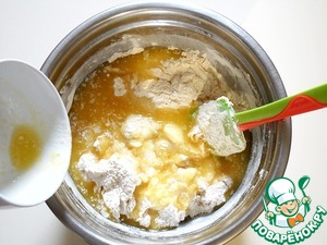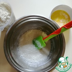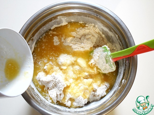 Добавить вторую половину муки, соединить, влить подтаявшее при комнатной температуре сливочное масло (или чуть нагреть его).