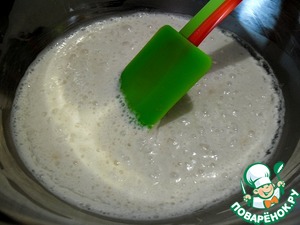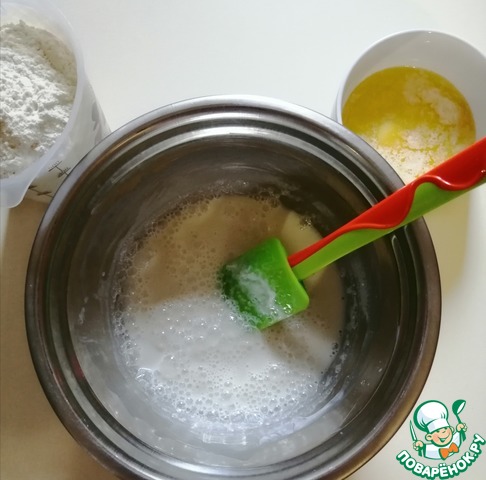Всыпать соду, размешать - она нейтрализует кислоту кефира, добавить остальной сахар, соль, половину муки, хорошо вымесить.