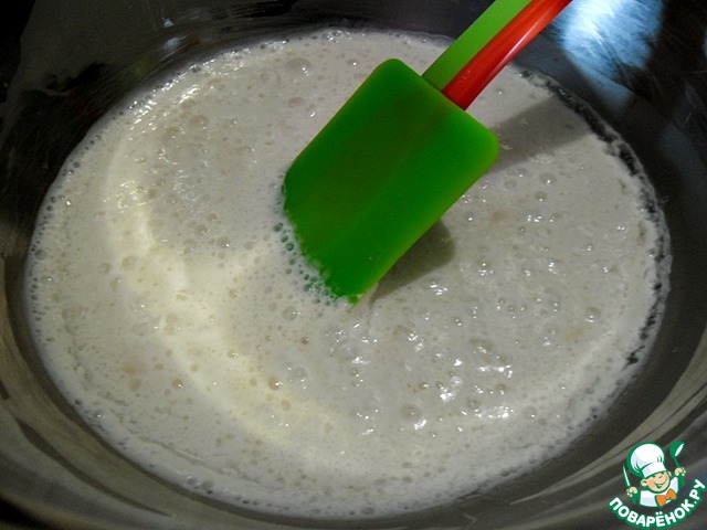 В теплой воде развести до растворения дрожжи, добавить кефир комнатной температуры и щепотку сахара, перемешать. Оставить до появления пузырьков по всей поверхности (20-30 минут).