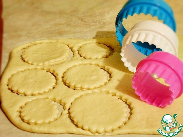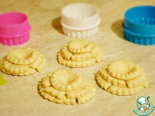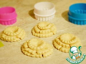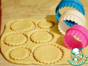 Раскатать в пласт толщиной 7-10 мм, кондитерскими вырубками вырезать разновеликие кружочки, можно стаканчиками разного диаметра. -