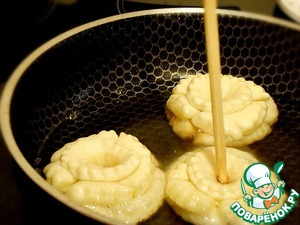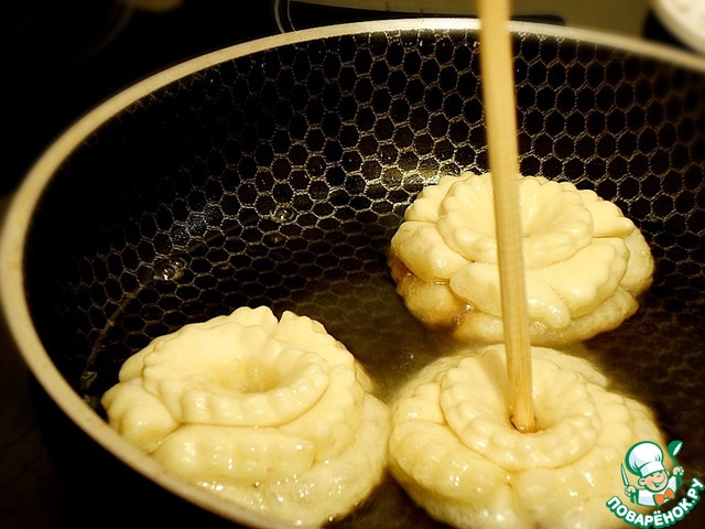 Теперь можно выпекать пышки на среднем огне. Тонкой палочкой проткнуть центр "пирамидки", опустить в масло и вращать быстрыми движениями вокруг оси. Масло будет проникать между слоями и пышки начнут словно "распускаться". Благодаря отверстию в тесте от палочки, масло кипит и в центре пышек, и они хорошо пропекаются, не смотря на многослойность. -