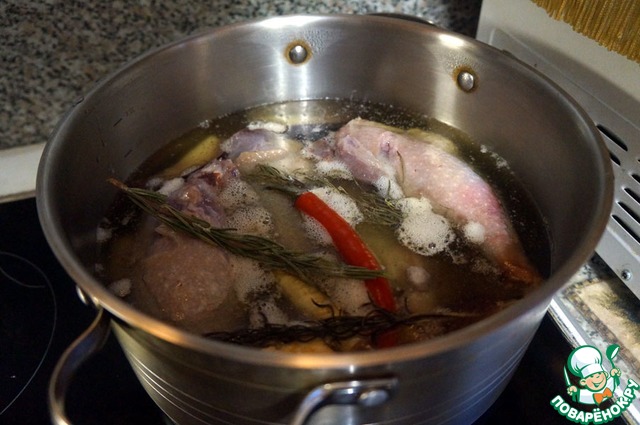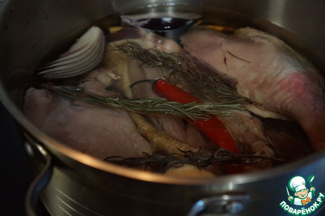Ножки и крылья нужно сначала высолить. Для этого их густо засыпать солью, перемешать и оставить на несколько часов, а лучше на сутки. После этого сложить в кастрюлю, туда же отправить очищенный и нарезанный четвертинками лук (у меня фиолетовый), корень пастернака, перец и розмарин.