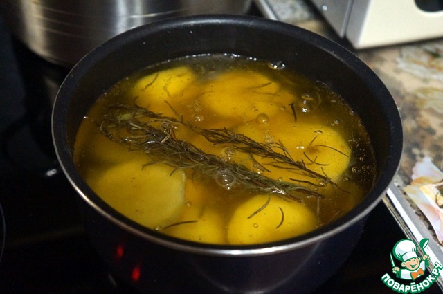 Сложить в кастрюлю, добавить розмарин, посолить, залить маслом, довести до кипения, убавить огонь и готовить минут 20.