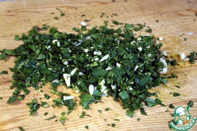 Петрушку и очищенные зубчики чеснока мелко порубить.