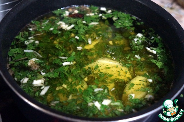 Перед самой готовностью картошки добавить к ней смесь петрушки и чеснока и снять.