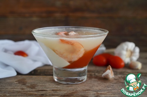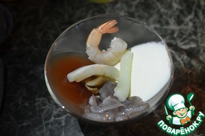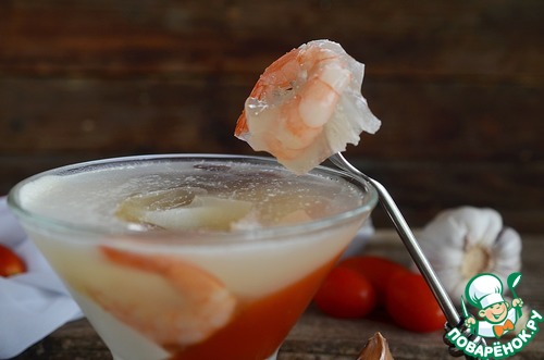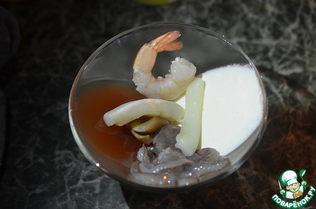 Красивое порционное заливное из морепродуктов. Оригинально смотрится на столе благодаря интересному сочетанию слоев. Готовится очень просто - главное хорошо охладить каждый слой.