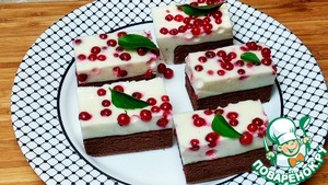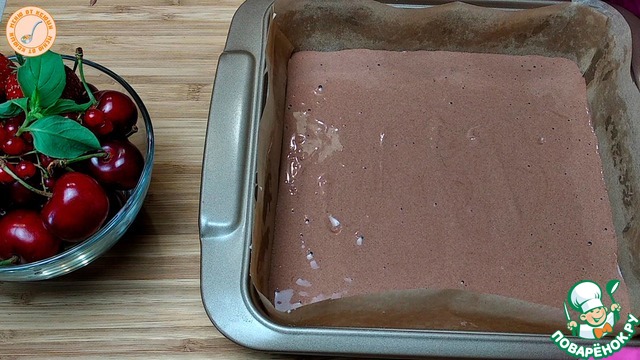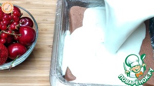 Шаг 6 Помещаем шоколадный бисквит в форму и заливаем молочной смесью, украшаем ягодами красной смородины. Ставим остывать
