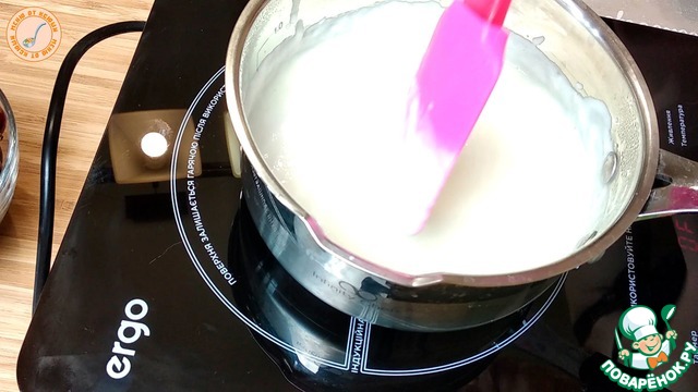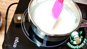Шаг 5 В молоко добавляем агар-агар, провариваем 1 минуту после закипания. Сюда же добавляем сливки и сгущенку