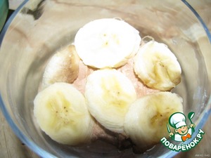 В креманку выложить половину массы с какао. Банан нарезать колечками и выложить сверху.
