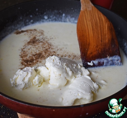 • Готовим соус. В сотейнике растапливаем сливочное масло, добавляем муку и обжариваем ее, тщательно размешивая. Продолжая непрерывно размешивать, тонкой струйкой вливаем молоко. Затем добавляем маскарпоне, соль и черный молотый перец. Мешаем до однородной консистенции соуса.