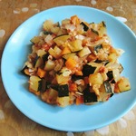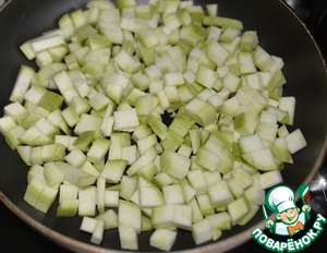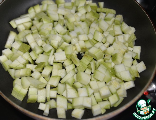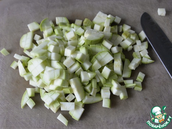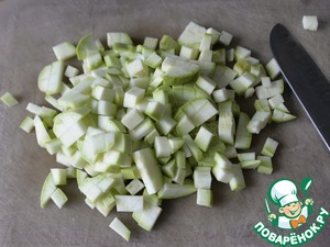 Кабачок лучше брать молодой, если старый, то чистим от кожуры и семян. Режем мелкими кубиками.