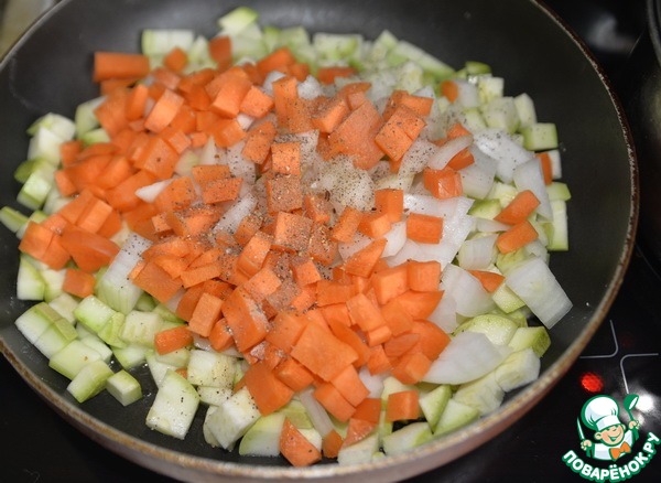 Мелкими кубиками режем также лук и морковь. Добавляем к кабачкам и тушим все вместе 20 минут, добавив масло и перец по вкусу.