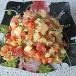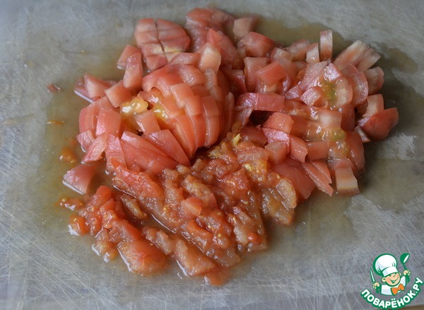 Помидоры ошпариваем кипятком, снимаем с них кожицу. Режем мелкими кубиками.