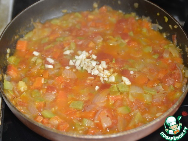 В исходном рецепте не было чеснока, но мне кажется, тут он в тему. Кладём мелко рубленный чеснок.