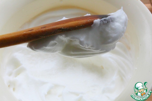 Белки со щепоткой соли взбить миксером до крепких пиков - белки не падают с перевернутой ложки.