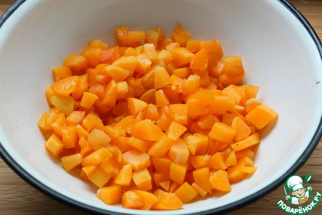 Желе приготовить по инструкции, но использовать не 200 мл кипятка а 170 мл. Выливаем горячее желе в абрикосы.