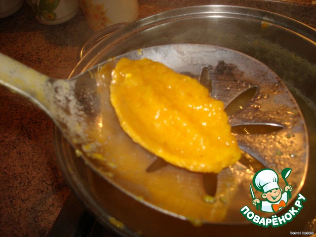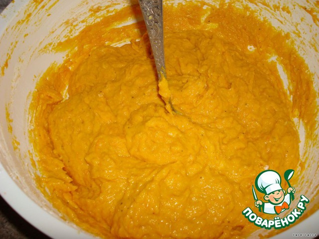 1кг 400г, так что все продукты на такое количество тыквенной массы) и хорошо размять,можно взбить миксером. Добавить яйца, соль,немножечко мускатного ореха и чёрного молотого перчика, всё хорошенечко перемешать и добавить муку, консистенция должна быть как густая сметана -