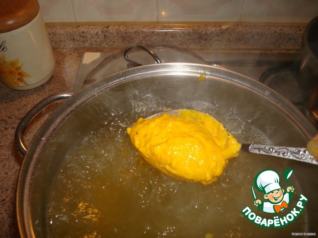 Пока готовите тесто, поставить кастрюлю с водой на огонь. Когда вода закипит, добавить немного соли и, формируя двумя столовыми ложками