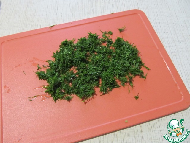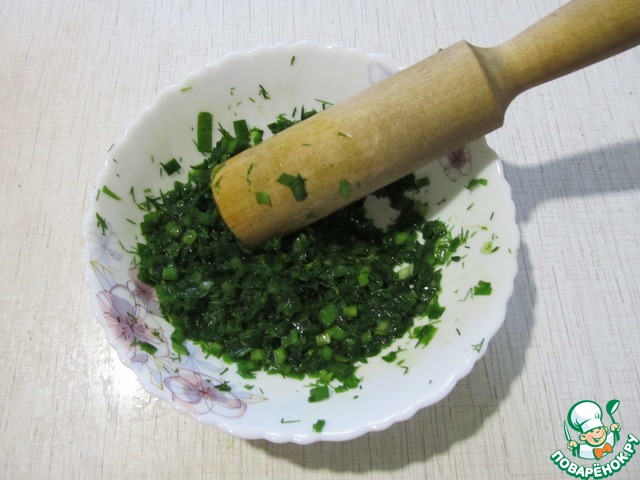 Смешать лук с укропом, добавить 2ч. л соли и хорошо размять.