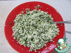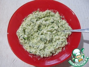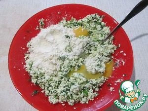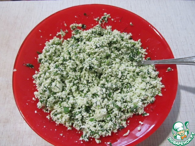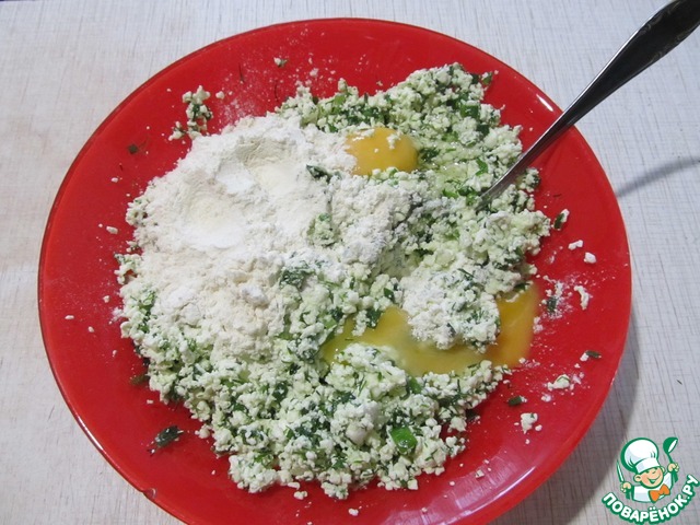 Зелень смешать с творогом. Попробовать на соль. Мы любим эти вареники именно соленые, поэтому я смело добавляю еще 1ч. л соли.