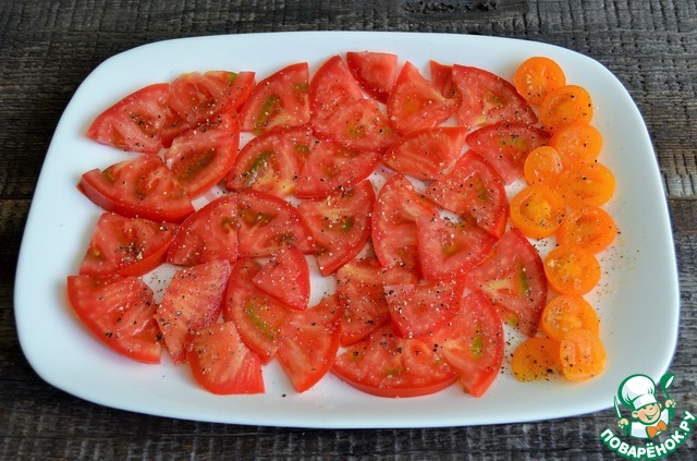 • Помидоры нарезать пластинами, разложить на блюде или подносе,