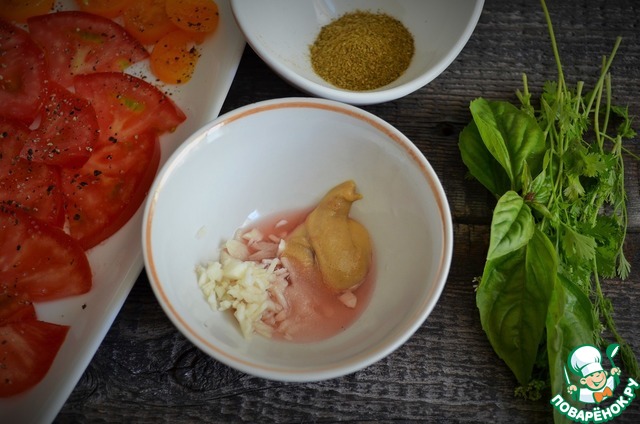 • Смешать в пиале молотый чеснок, горчицу, сахар, уксус,