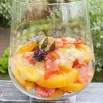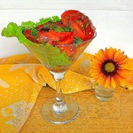 • В широкий салатник или для более праздничной подачи в широкий бокал, креманку выкладывать слоями помидор, соус, зелень, хмели-сунели.