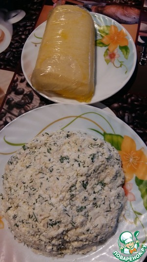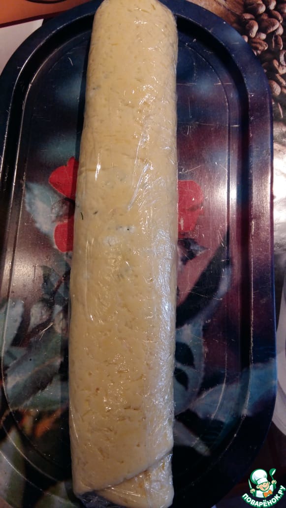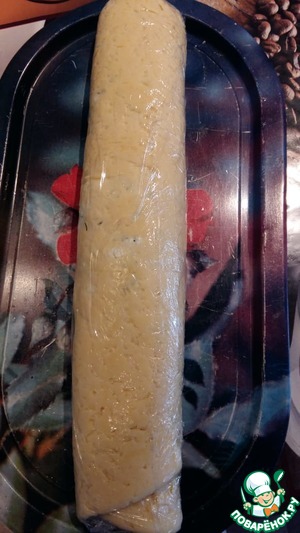 • Сворачиваем в рулет, заворачиваем в пищевую пленку, и отправляем в холодильник на 2 часа.