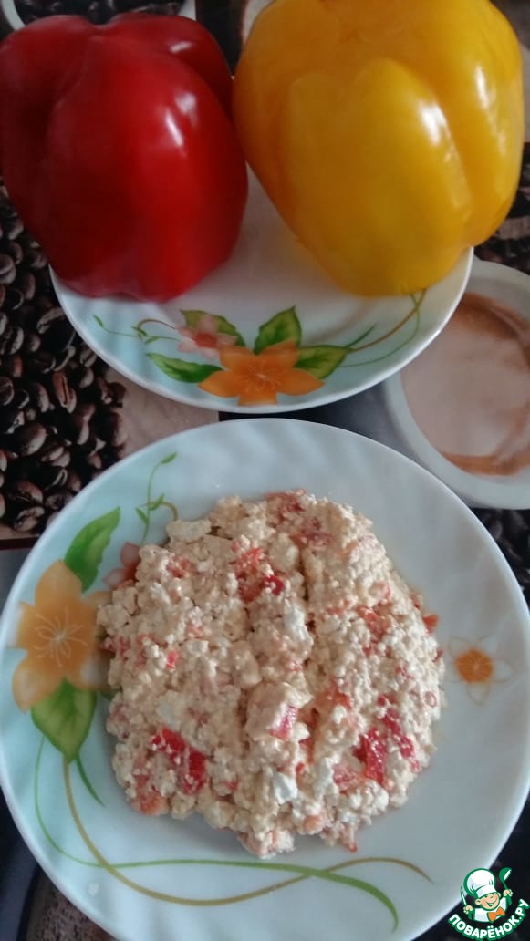 Творог смешать с брынзой и майонезом, добавить чеснок.