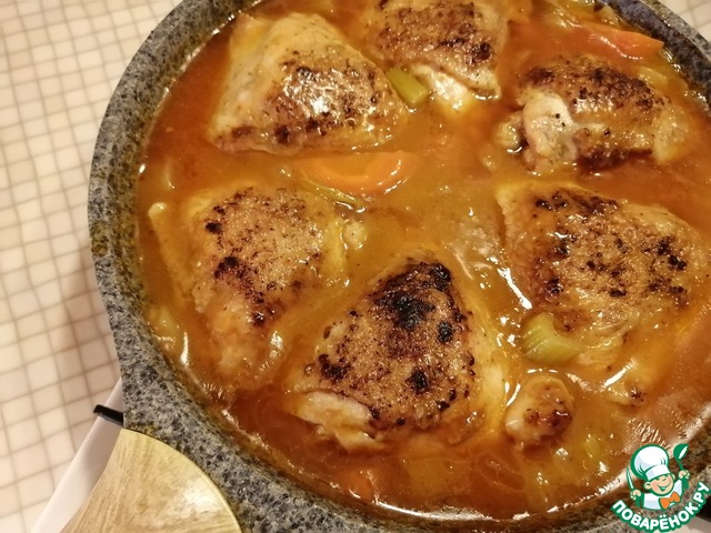Сочные, нежные куриные бедрышки с овощами во вкусной подливе на обед или ужин.