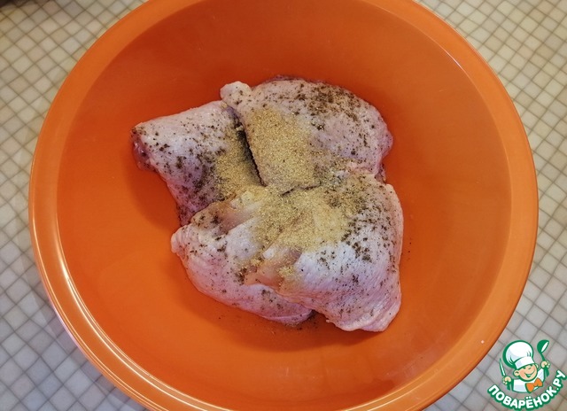 Бедра посыпать чесночным порошком, перцем, солью. Хорошо втереть специи в куриные бедра.