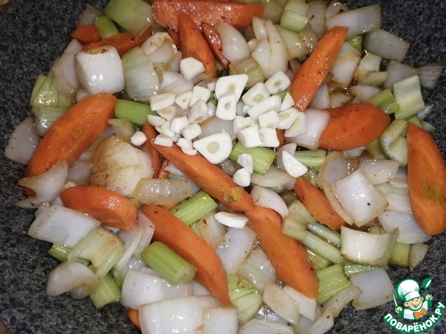 Обжарить лук, морковь, сельдерей в сковороде, где обжаривали куриные бедра 5-7 минут.