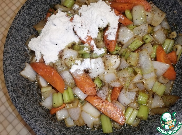 Посолить и поперчить по вкусу. Добавить муку, перемешать. Обжарить 2 минуты.