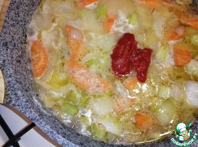 Налить воды, добавить томатную пасту и хорошо перемешать.
