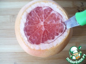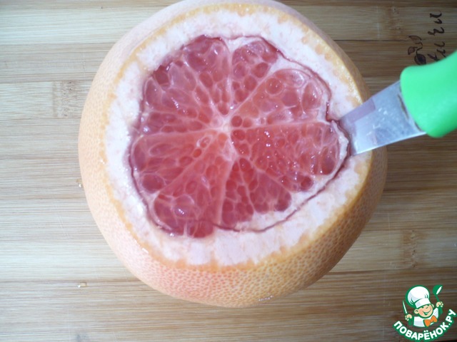 Затем срежьте и верхушку у грейпфрута. (Точно также обрежьте и второй грейпфрут)