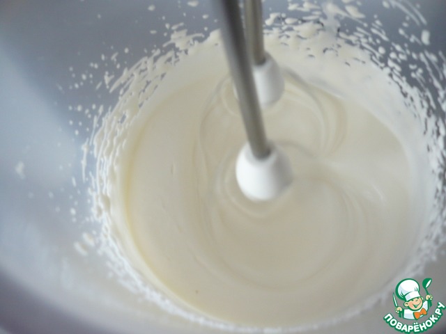 Затем в холодные сливки добавьте сгущенное молоко и взбейте миксером до образования плотных пиков.
