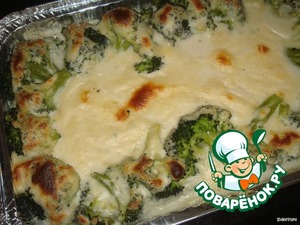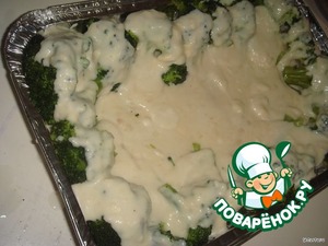 Брокколи поливаем оставшимся соусом.Ставим в заранее разогретую духовку до 180 град.до зарумянивания,на 15-20мин.у кого какая духовка.