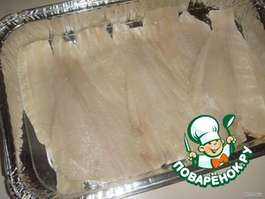 Выкладываем рыбу на смазанный маслом противень.Я не стала смазывать,у меня одноразовый.