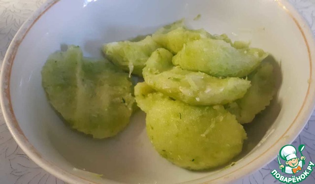 Жарить 10 минут до румяности кабачковой основы. Аккуратно выложить на большое блюдо.