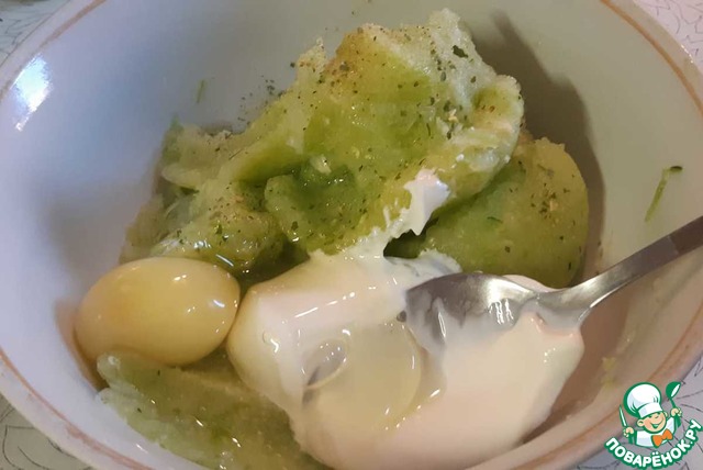 Добавить к кабачку яйцо, сметану и соль, тщательно перемешать.