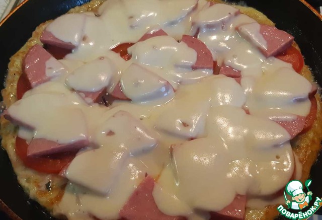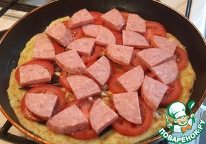 Выложить кабачковое тесто на разогретую смазанную подсолнечным маслом сковороду. Обжарить на одной стороне 10 минут до румяности. Перевернуть при помощи подноса (металлического) или второй сковороды. На второй стороне жарить также 10 минут. За это время быстро выложить начинку слоями в следующей последовательности.
