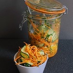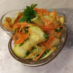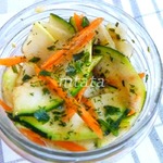 Кабачки нарезать тонкими кружочками, морковь натереть на терке для моркови по-корейски.