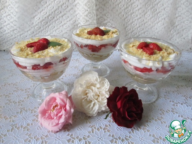 В период урожая клубники хочется успеть приготовить не только варенья, но различные десерты, салаты, выпечку с клубникой. И тут мимо десерта с бананом не пройти. Классическое сочетание банана и клубники дополнено вкусным песочным печеньем и белковым кремом.