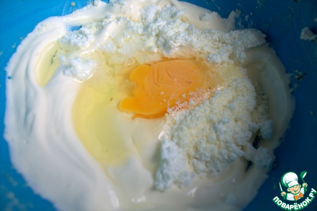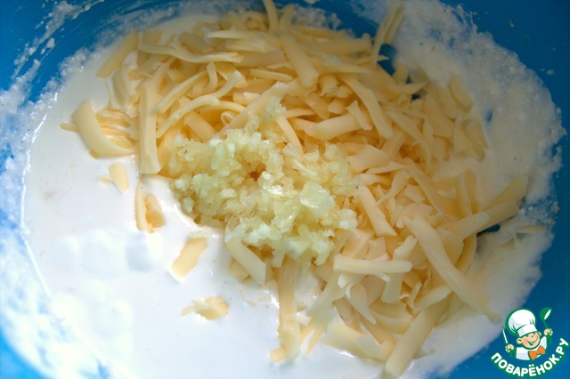 В сметану добавляем яйцо, творог, сыр. Выдавить чеснок.