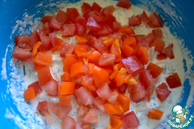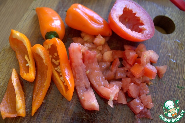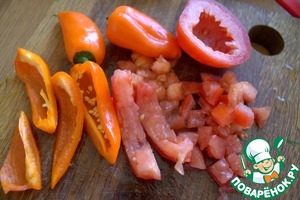 Из помидора удалить сок, нарезать и перчики тоже.