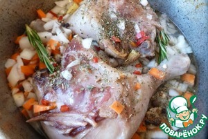 В сковороду к утке положить овощи, специи и обжарить минут 5. Затем влить вино. Убавить огонь до минимума и томить утиные ножки под крышкой часа 2,5-3 до мягкости мяса. Оно должно буквально сползать с костей. За это время перевернуть ножки несколько раз и долить немного воды (или бульона), если это потребуется. Но лучше, чтобы мясо слабо томилось в собственном жире.