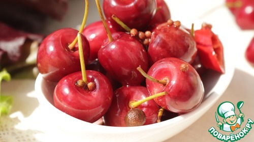 Подготовить ингредиенты для закуски. Черешню помыть, наполовину обрезать черешки.